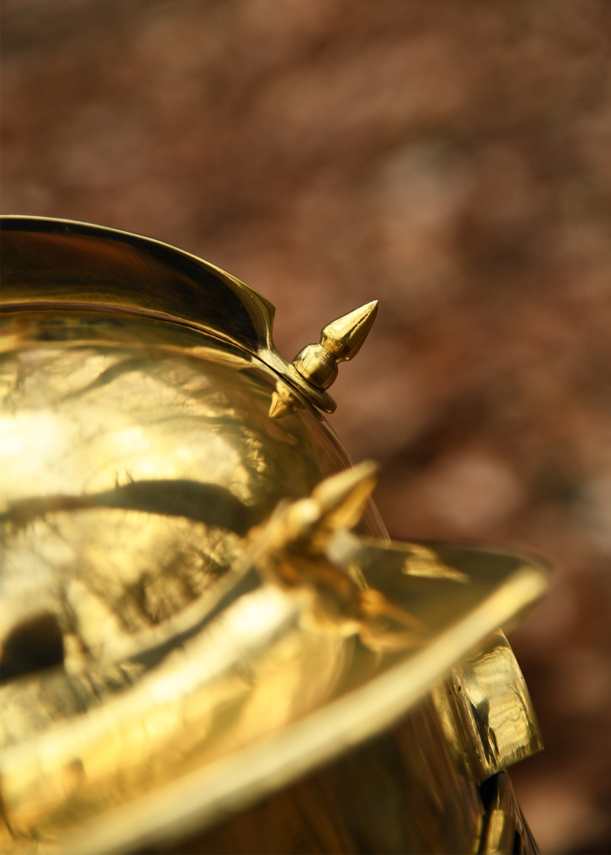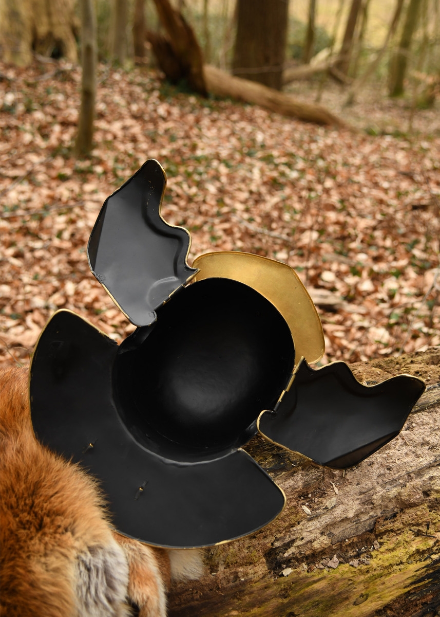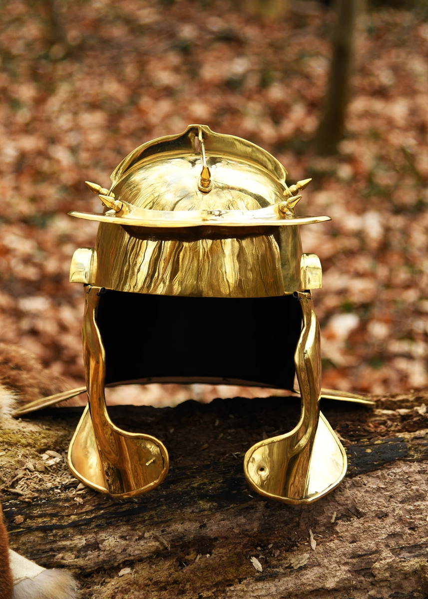 Battle Merchant, Auxiliary Infantry Hjelm, von Gravert (Niederbieber) er en autentisk romersk auxiliar hjelm fra 2.–3. århundrede. Fremstillet i 1,2 mm messing med store kind- og kæbebeskyttere giver denne romerske hjelm høj beskyttelse og er ideel til reenactment, samling og historisk formidling.