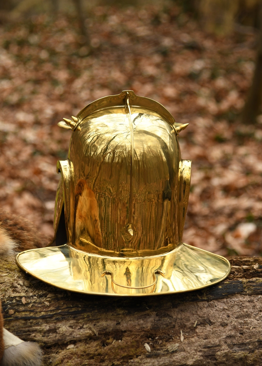 Konstruktionen kendetegnes af store kæbe- og kindflapper, der dækker tinding, kind og hage og er forbundet fortil med en låsepin. Hjelmens skål er forstærket med overliggende ribber, mens en bred nakkeskærm (ca. 9 cm) beskytter nakken effektivt. Spidser ved ribbernes hjørner og ved pandeskærmen har sandsynligvis haft til formål at aflede slag fra modstandere. Resultatet er en robust hjelm, der kombinerer sikkerhed, komfort og historisk autenticitet.