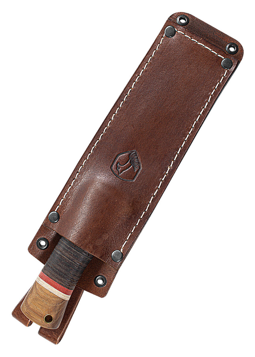 Kniven leveres med en håndlavet læderskede, der både beskytter bladet og gør den nem at bære sikkert i bæltet.