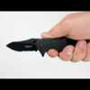 Kniven er udstyret med et stort drop-point blad i 8Cr13MoV rustfrit stål med sort oxid-belægning. Det delvist savtakkede blad gør det nemt at skære gennem seler, webbing og reb, mens den indbyggede linecutter hurtigt klarer nylon-snore. SpeedSafe® assisteret åbning sikrer lynhurtig enhåndsbetjening via både flipper og tommelstud – klar til brug med det samme.