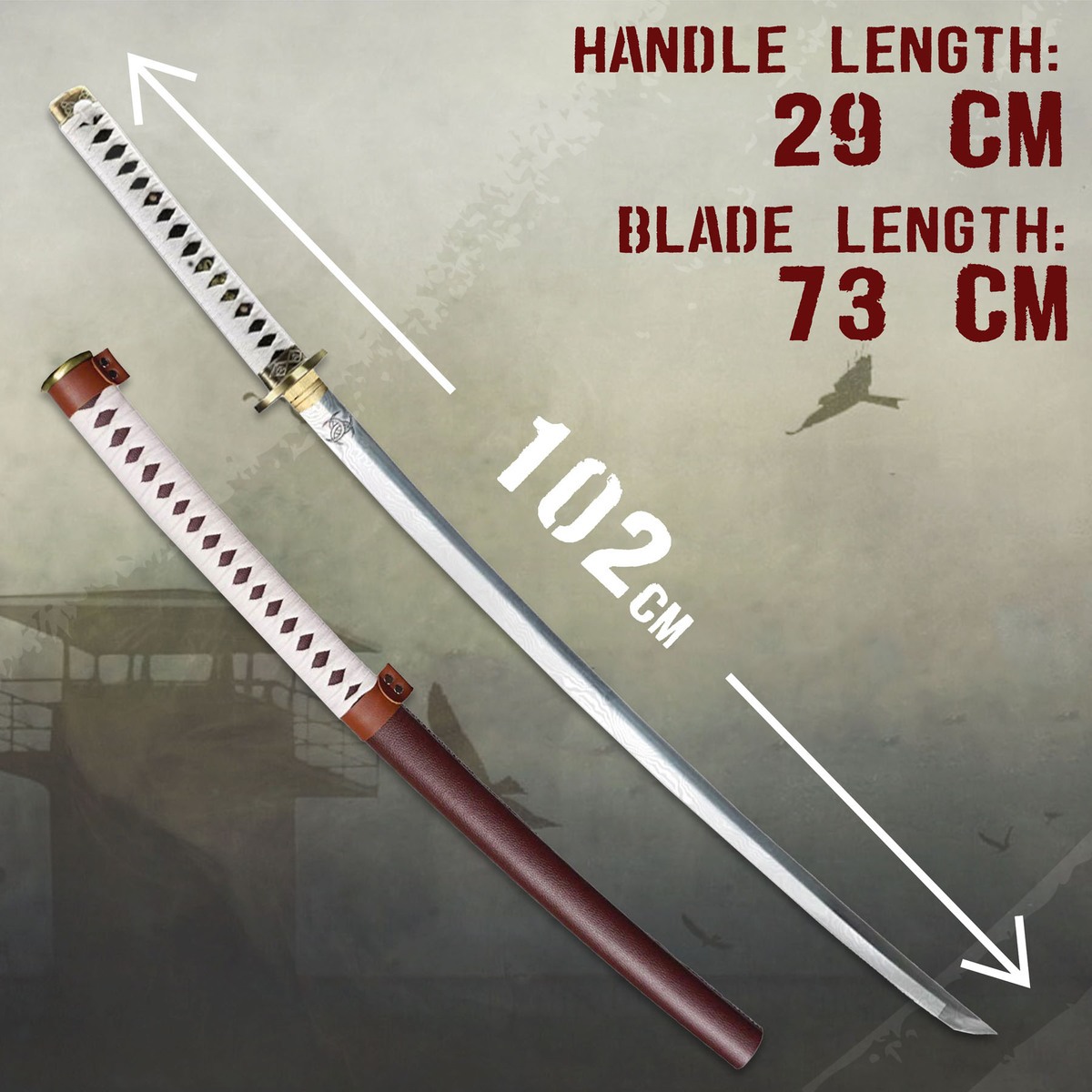Denne katana er udstyret med en 73 cm lang, foldet og skarp stålklinge, som giver et autentisk og råt udtryk. Kombinationen af håndsmedet kvalitet og solid vægt gør sværdet både imponerende og realistisk – ideelt til samling, cosplay eller display.