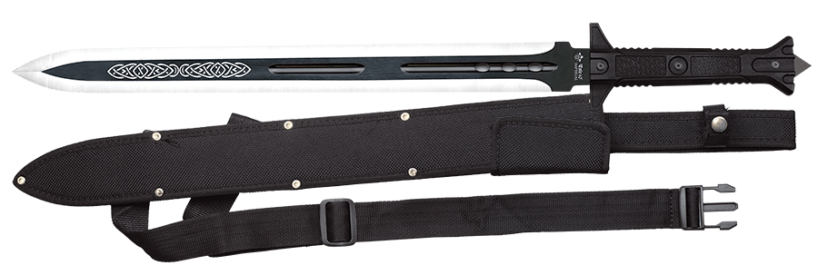 Håndtaget er fremstillet i sort ABS, som giver et sikkert og komfortabelt greb, selv under længere brug. Sværdet leveres med en sort nylonskede, som beskytter klingen og gør det nemt at transportere og opbevare.