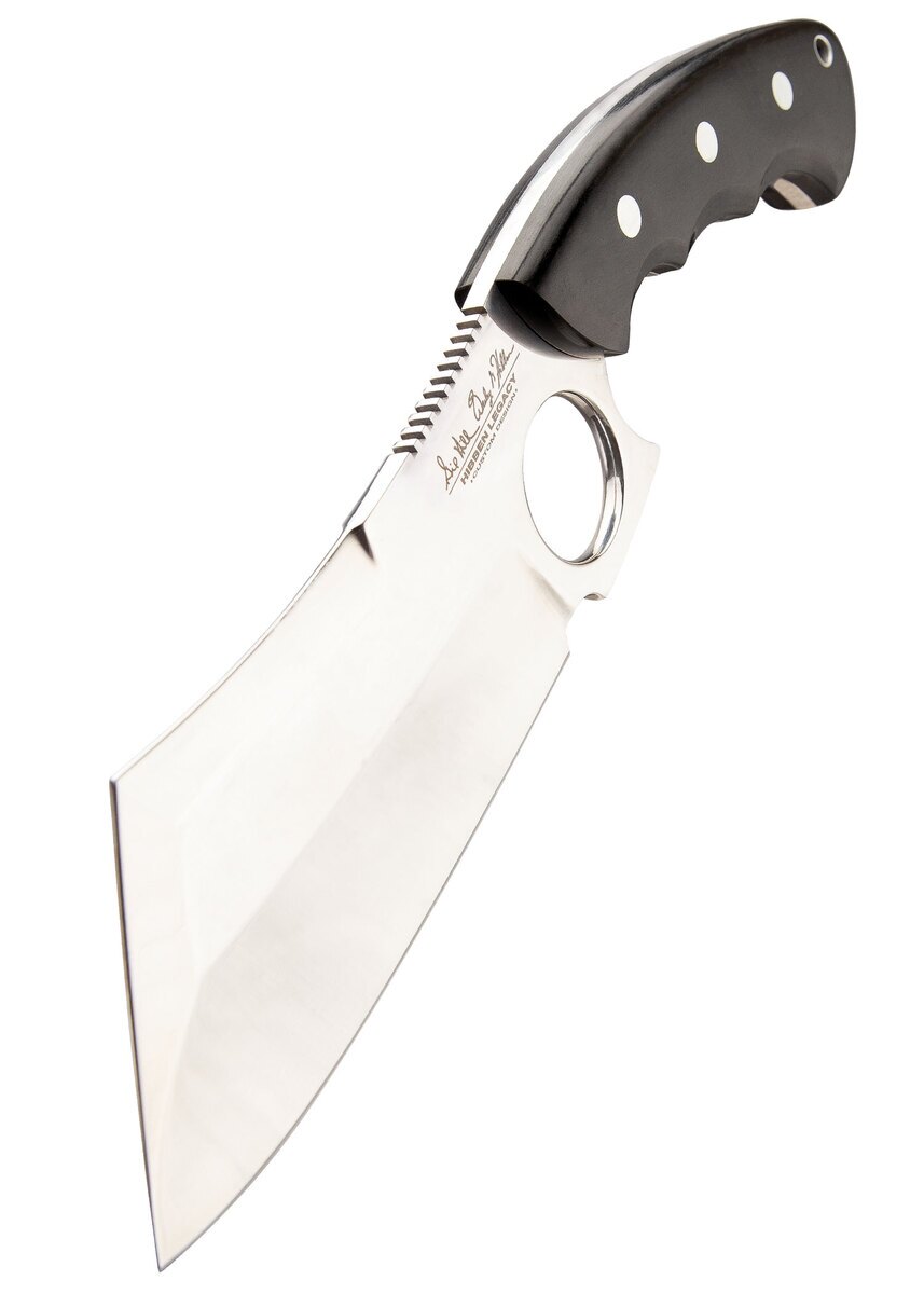 Denne Hibben cleaver kniv leveres med en sort læderskede med bæltestrop, så den nemt kan bæres og opbevares sikkert. Perfekt som samlerkniv, outdoor værktøj eller taktisk kniv.