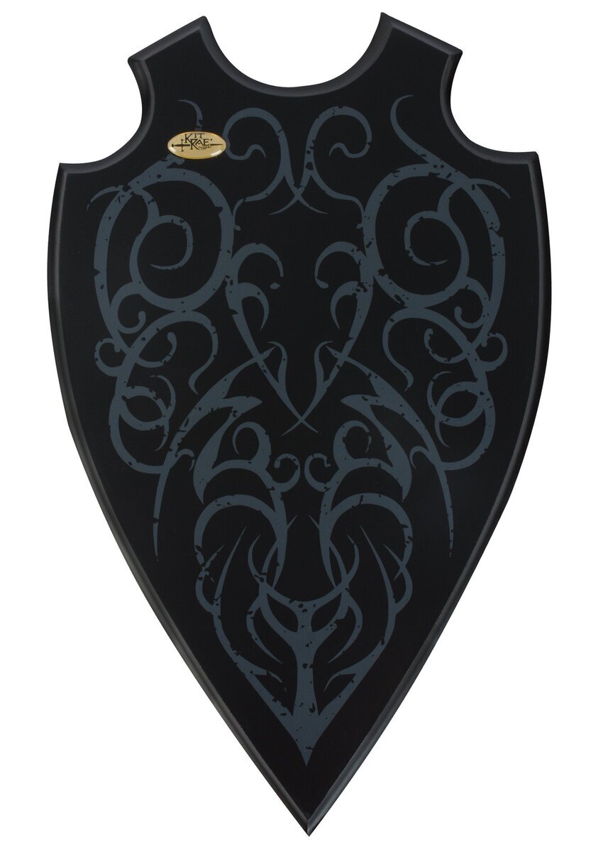 Denne skjoldformede sværd plaque er fremstillet i solidt træ og lakeret i sort, hvilket giver et elegant og tidløst udtryk. Det grå tribal-mønster tilføjer et unikt fantasy look, som gør den perfekt til udstilling af både United Cutlery Sværd, fantasy sværd og andre dekorative våben.