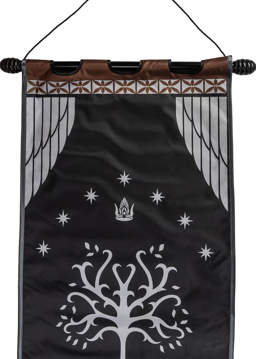 Banneret er fremstillet i slidstærkt nylon og imponerer med sit detaljerede design. I centrum ses det ikoniske White Tree of Gondor, omgivet af syv stjerner, som symboliserer Palantíri og Elendils arv, samt kronen som tegn på kongemagt og ære.