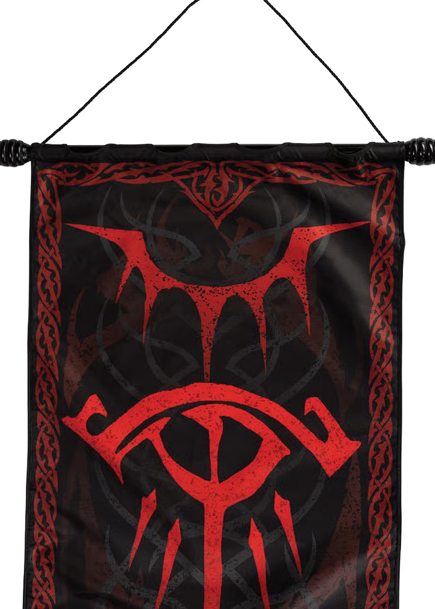 Banneret er fremstillet i slidstærkt nylon og prydet med et detaljeret og dramatisk design. I centrum finder du det ikoniske Eye of Sauron – altseende og truende – omgivet af blodrøde symboler, der skaber en stærk visuel effekt.