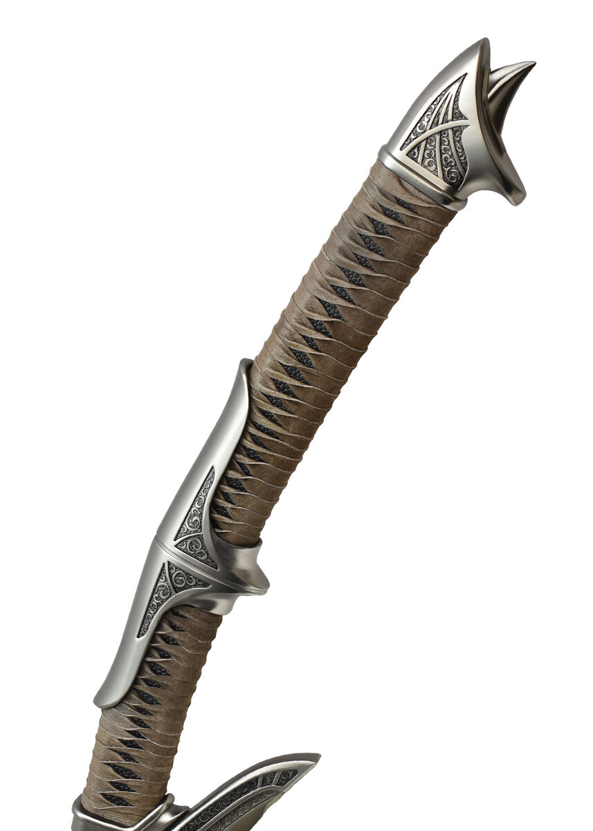 Parérstykke, greb og pommel er fremstillet i metal og udført i samme detaljerede dark iron-finish, præcist efter designerens originale specifikationer. Håndtaget er omviklet med ægte mørkebrunt læder, som giver både et autentisk udseende og en solid fornemmelse. Pomlen er formet som en rustningsgennembrydende spids, hvilket fuldender det aggressive og kraftfulde design.