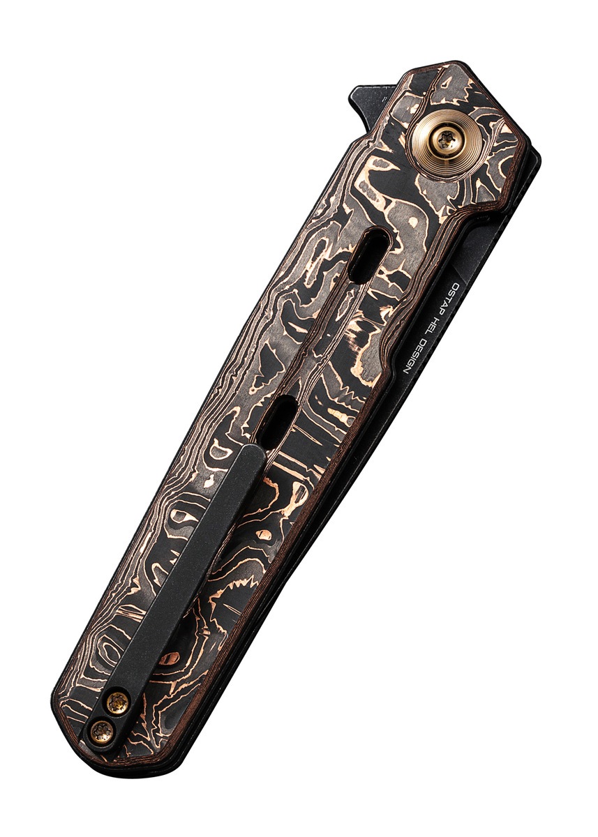 Håndtaget er lavet i carbon fiber med copper foil, hvilket giver et eksklusivt og levende udtryk. Samtidig hjælper de integrerede udskæringer med at reducere vægten og forbedre grebet. Med en vægt på kun ca. 81 gram er den utrolig let at have med i lommen.
