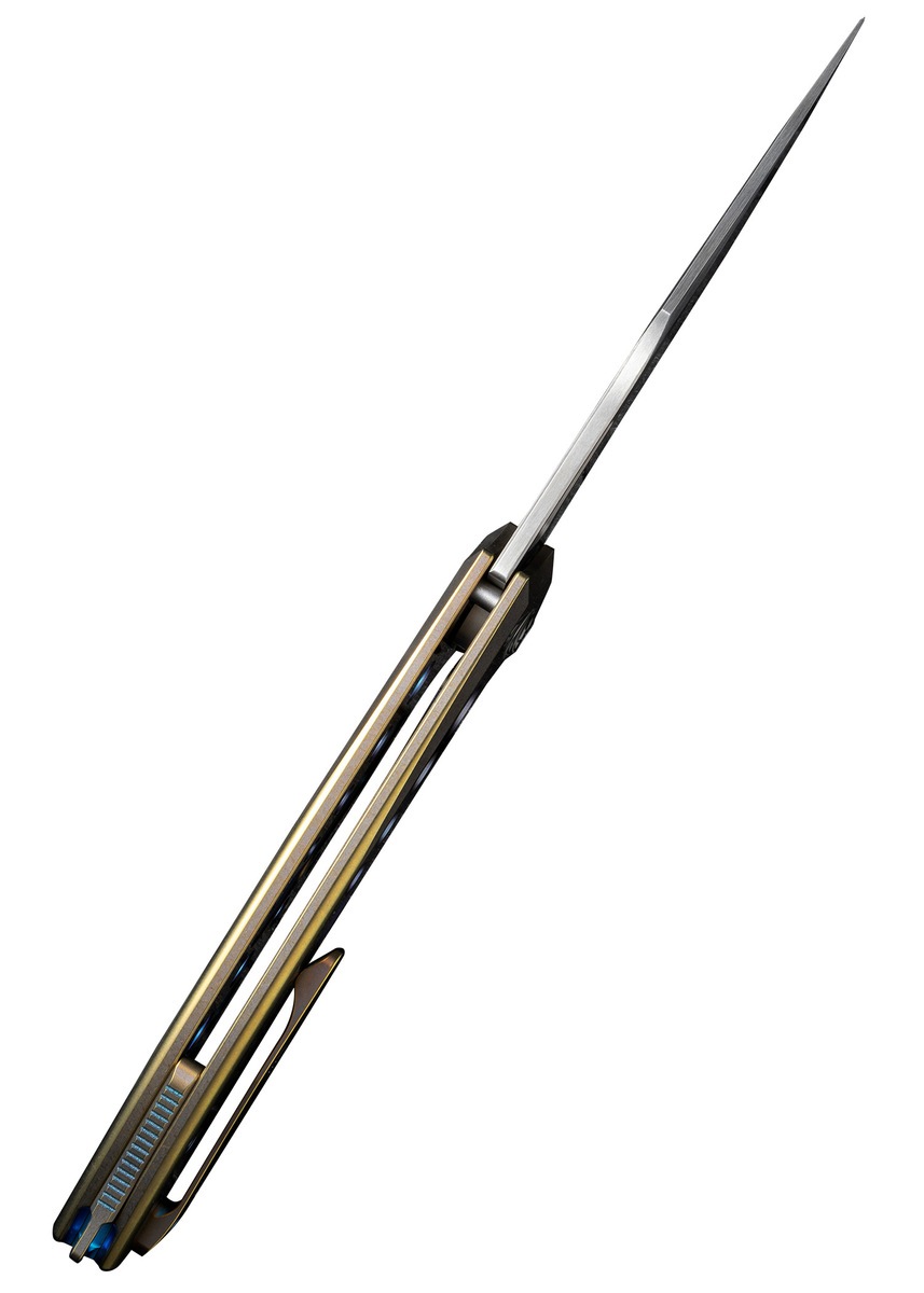 Håndtaget er lavet i fræset 6Al4V titanium med et unikt mønster, der både reducerer vægten og giver et sikkert greb. Kombinationen af blå titanium og gulddetaljer giver kniven et eksklusivt og næsten luksuriøst udtryk, som virkelig skiller sig ud i en samling.