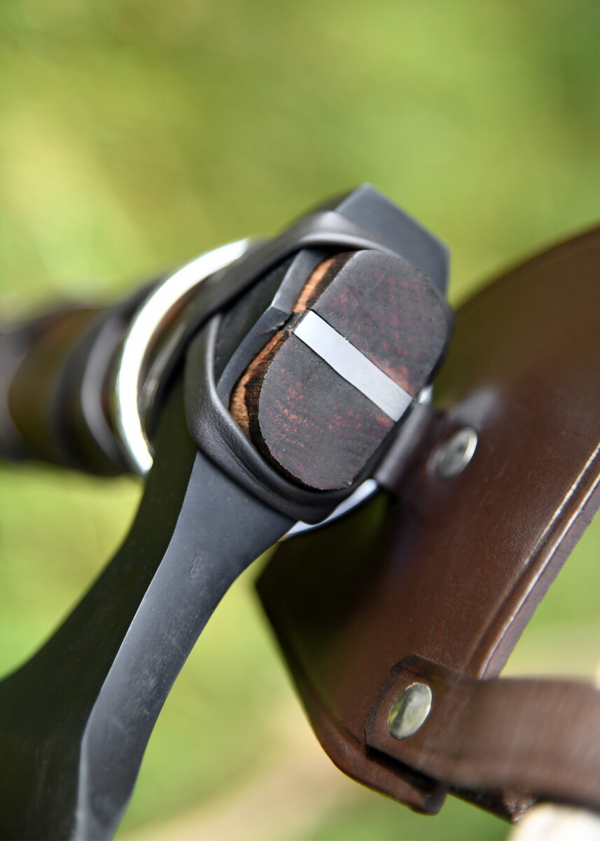 Øksen leveres med en læderbælteholder, der gør den nem at bære som en del af et kostume og fuldender det autentiske udtryk.