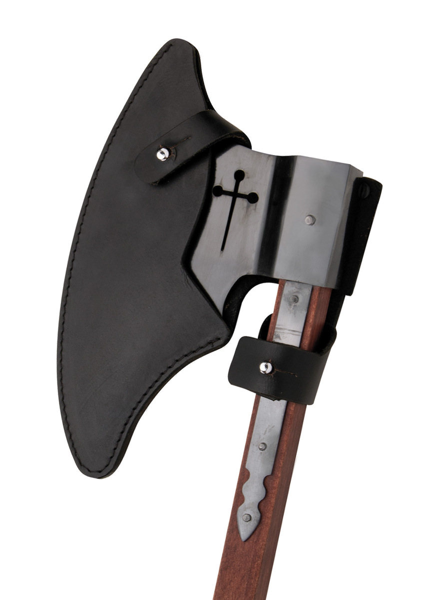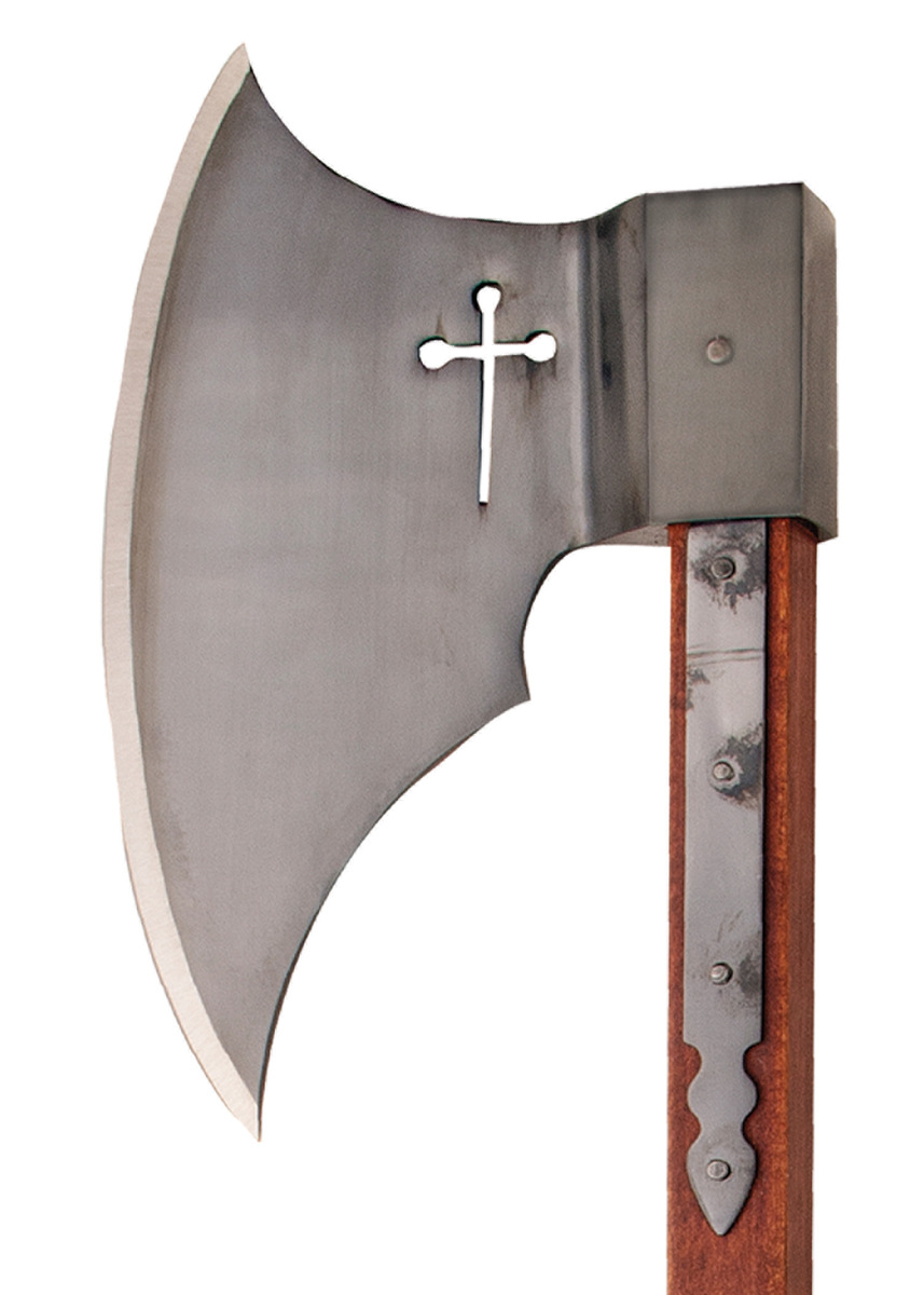 Øksehovedet er fremstillet i high carbon steel og har en stor, kraftig klinge, som er slebet og gennembrudt af et markant kors – et stærkt symbol på korsriddernes tro og mission. Klingen er solidt nittet fast til skaftet og forstærket med langetter, der giver ekstra stabilitet og et troværdigt historisk udtryk. Alle metaldele er sortnerede, hvilket understreger øksens dystre og krigeriske æstetik.