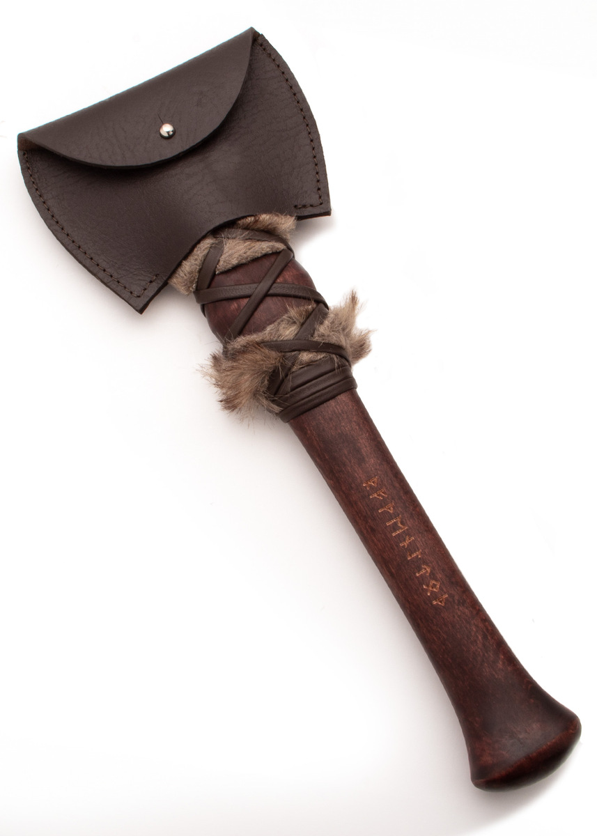 Øksen er en kompakt og kraftfuld brugsøkse med et skaft i hårdttræ, omviklet med kunstpels og læder for et autentisk udtryk. Skaftet er dekoreret med nordiske runer, der symboliserer blandt andet rejse, styrke, beskyttelse og krigerånd. Øksehovedet er smedet i 1055 carbon steel, hvilket giver solid slagkraft, god holdbarhed og en skarp æg, velegnet til lettere huggeopgaver og dekorativ brug. Med sin kompakte størrelse fungerer den perfekt som bælteøkse.
