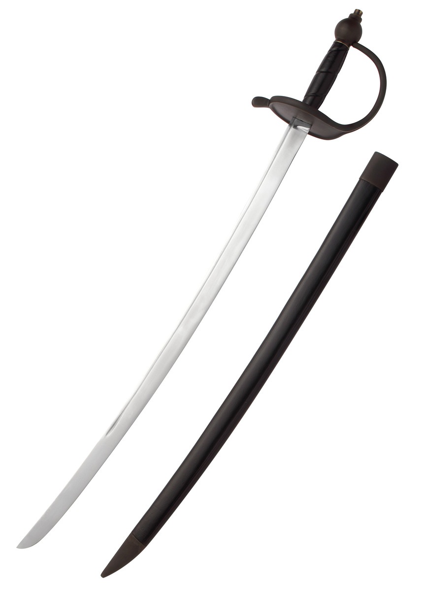 Klingen er fremstillet i 1065 højkulstofstål, hvilket giver et autentisk historisk udseende og solid konstruktion. Parerstang, håndbøjle og knop er fremstillet i bronze med antik finish, hvilket giver sværdet et eksklusivt og klassisk piratudtryk.
