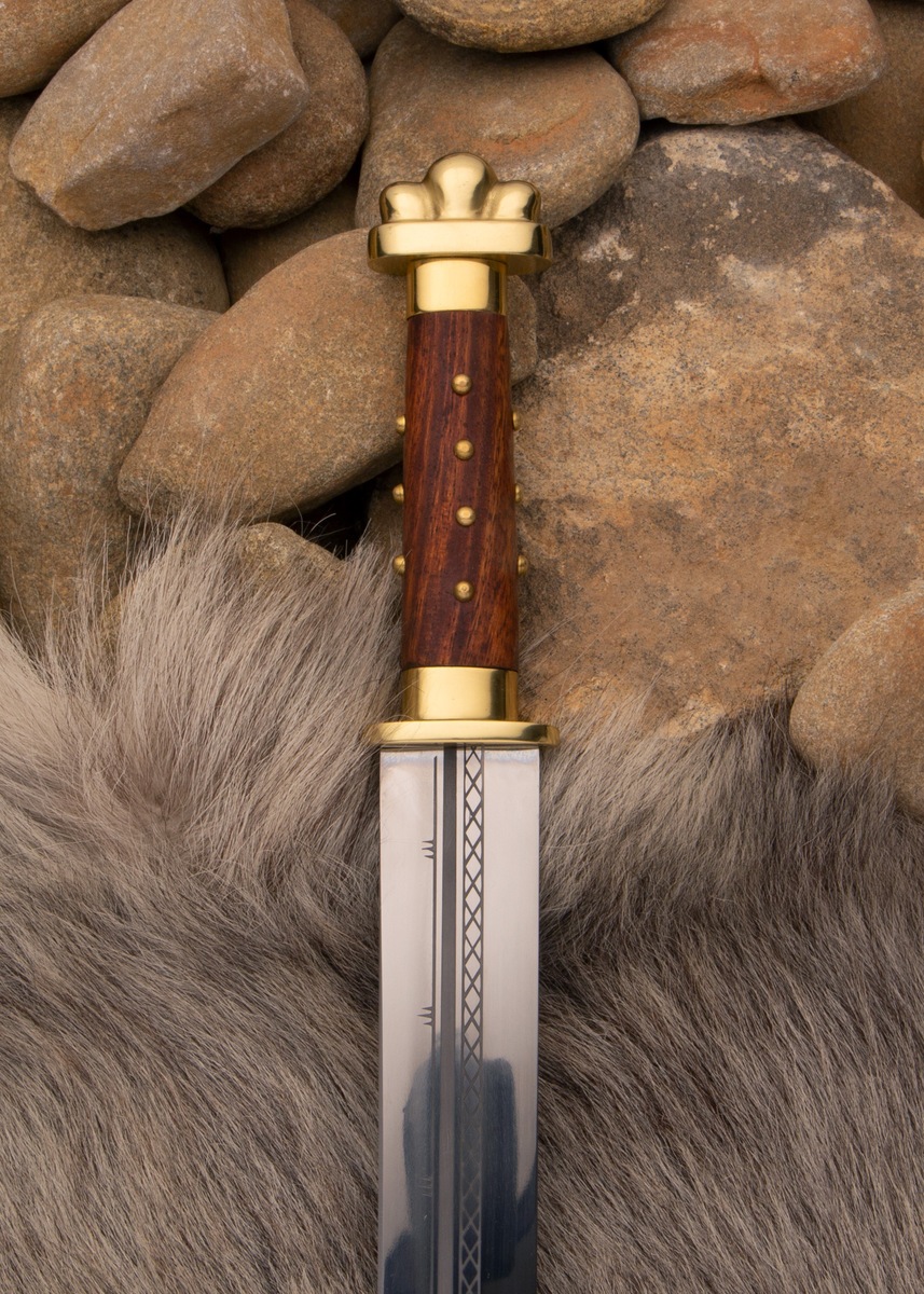Klingen er fremstillet i 1055 højkulstofstål og er slebet fladt for optimal skarphed og holdbarhed. Grebet er lavet af træ dekoreret med messingnitter, hvilket giver både et sikkert greb og et autentisk historisk udtryk. Parerstang og pommel er udført i messing, hvilket fuldender det klassiske design.