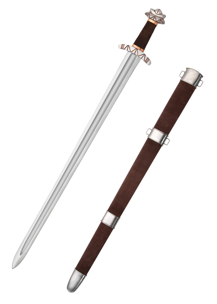 Parerstang og knop er dekoreret med kobberdetaljer, som giver sværdet et eksklusivt og historisk præg. Grebet er lavet af træ og beklædt med ruskind, hvilket giver et sikkert og komfortabelt greb. Sværdet leveres med en matchende træskede beklædt med ruskind, som fuldender det autentiske design.